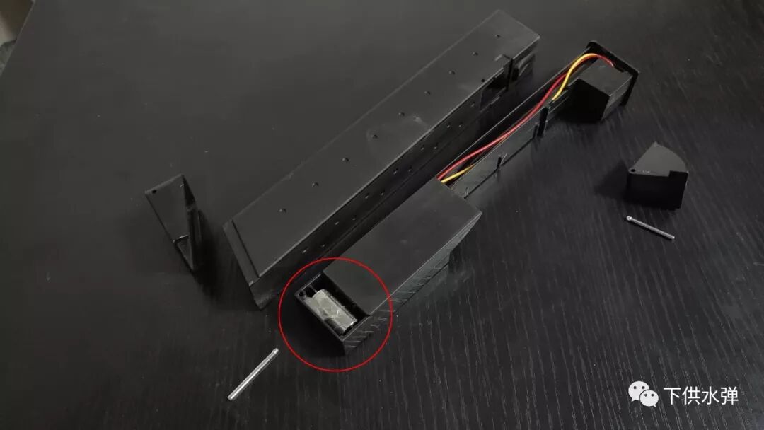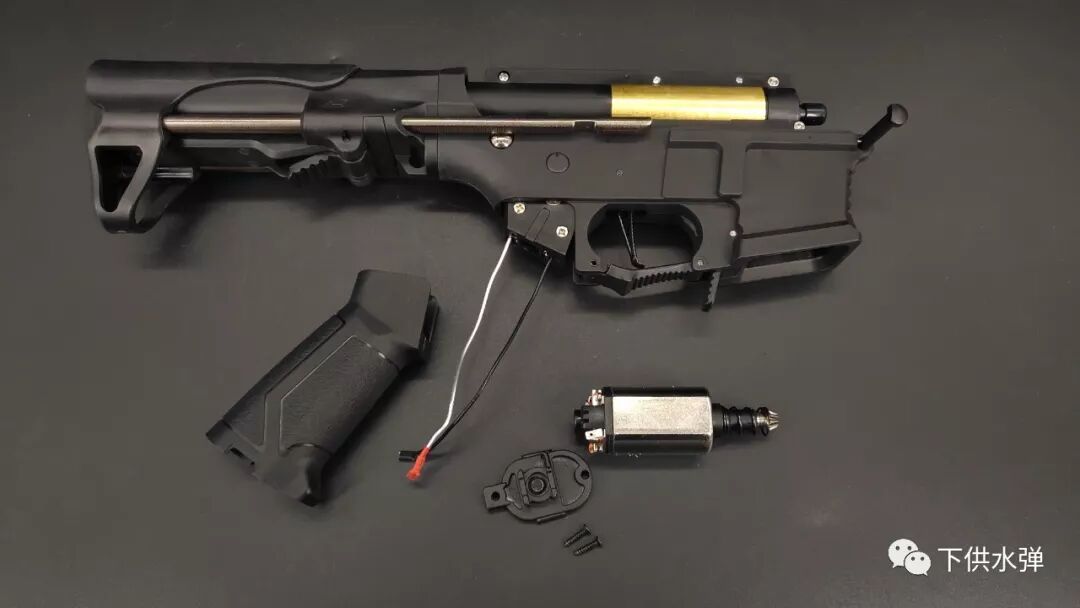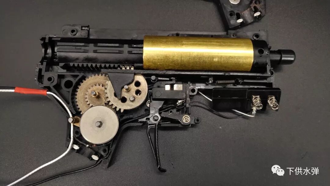 Dismantling the rifle reveals a 480 motor with action and gears in die-cast metal. It is connected to the gearbox by silver wires.