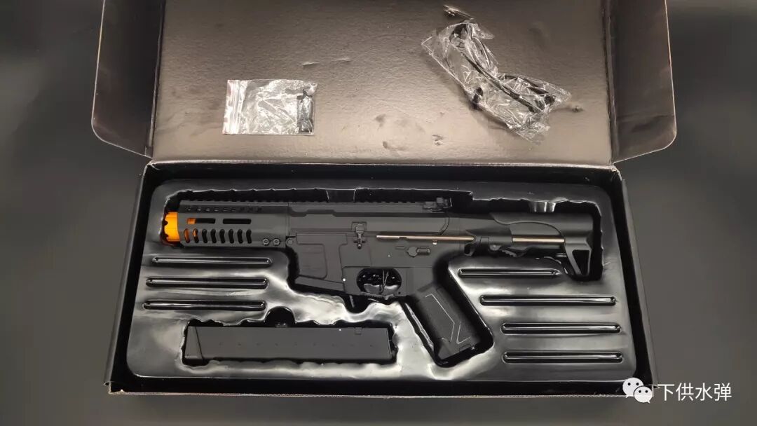 Its a standard black box. inside is very simple the product is completely assembled in this box we find the body of the ARP9 as well as the Magazine and a pair of glasses. Just install the magazine to have the finished this gel blaster.
